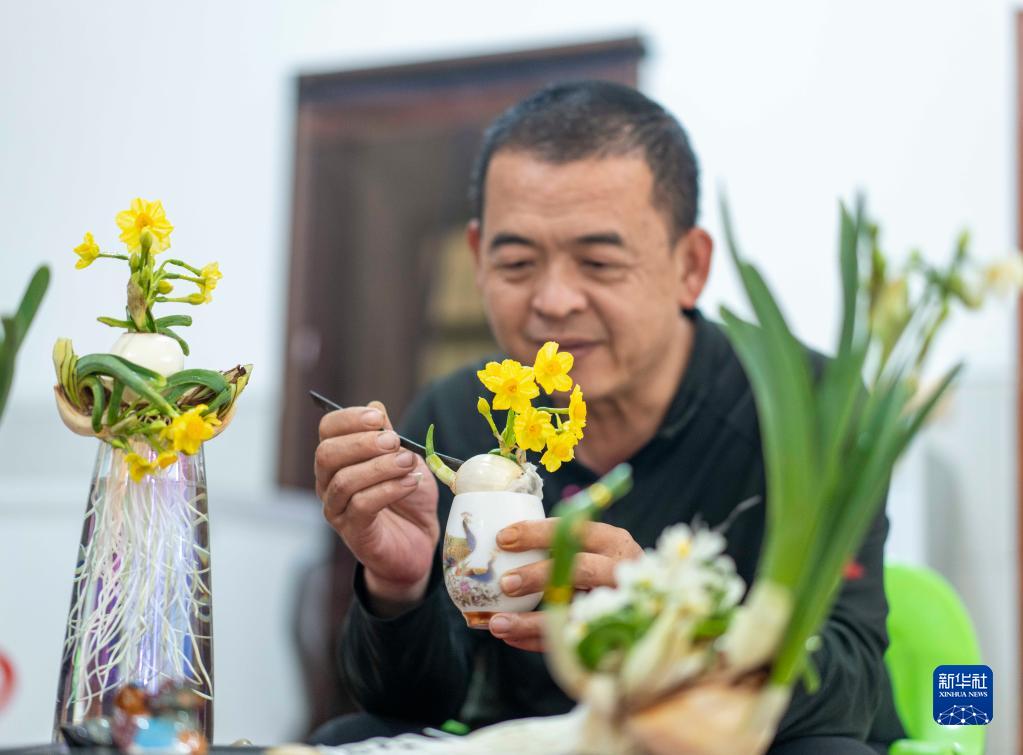 1月13日,在福建省漳州高新區九湖鎮田中央村,水仙雕刻師陳建清對水仙雕刻作品擺盆造型。
