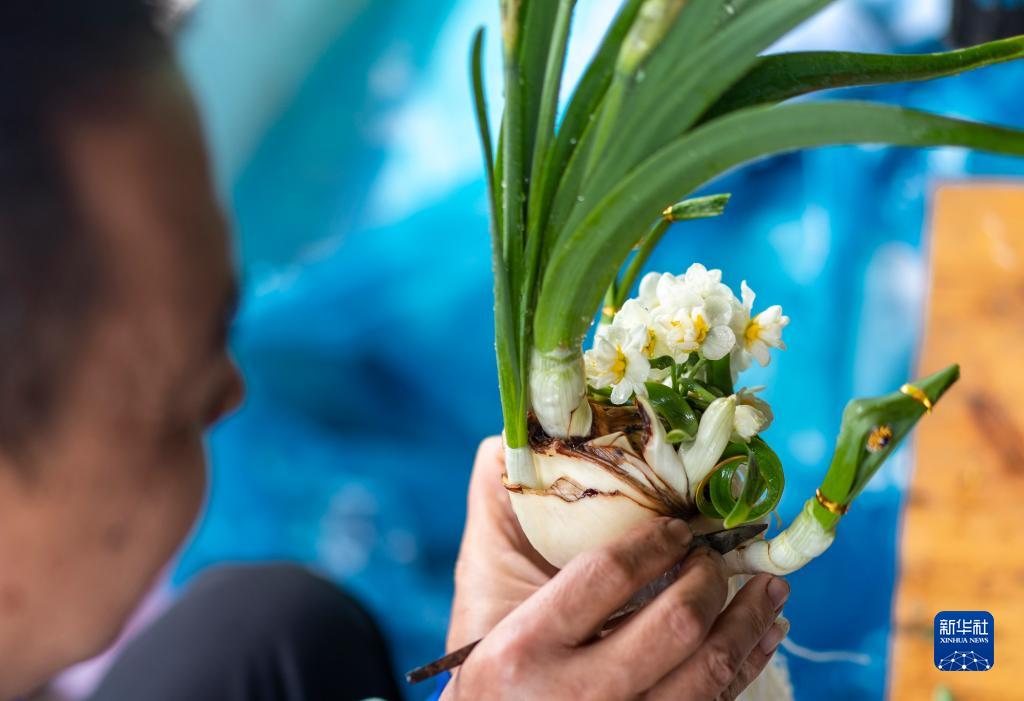 多年來,福建漳州花農探索出種球閹割、三年復種的水仙種植技術,收獲鱗莖碩大、花苞較多的花球。一顆飽滿的水仙花球要通過雕刻師開蓋、疏隙、削葉等雕刻步驟初步成形,經過一個月左右的養護,再加以創意雕琢,塑造出各式各樣的水仙花雕藝盆景,為新春佳節增添一抹詩情畫意。新華社發(張旭 攝)