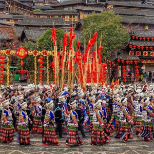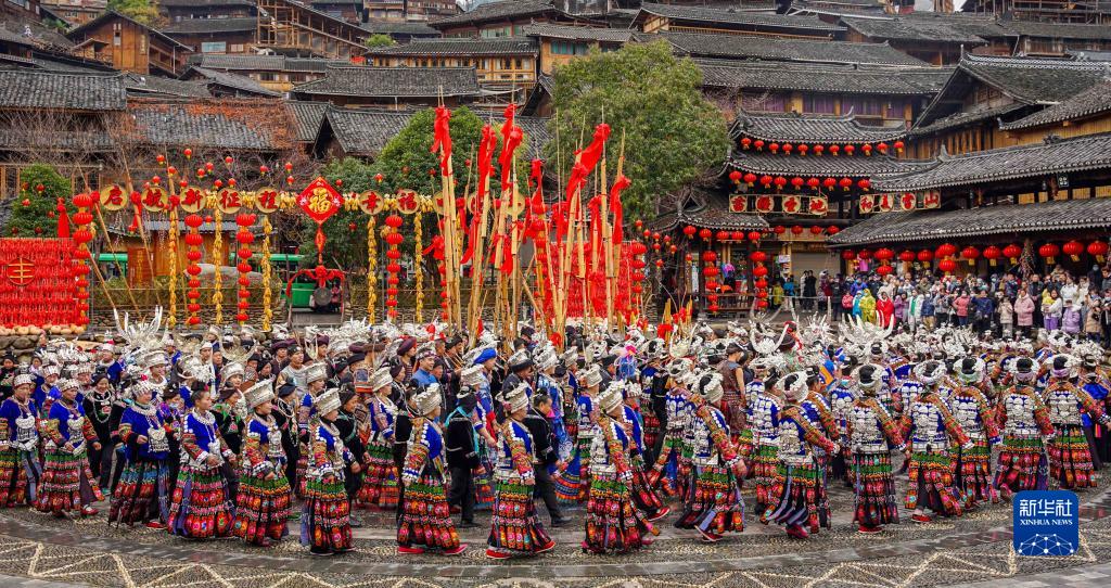 新春將至,在貴州省黔東南苗族侗族自治州雷山縣西江鎮,盛裝打扮的村民載歌載舞,熱鬧迎佳節。新華社發(龍順偉 攝)