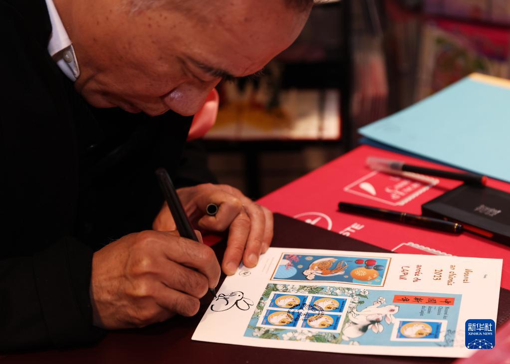 1月14日,在法國巴黎舉行的兔年生肖郵票發行儀式上,郵票設計者陳江洪為集郵愛好者簽售兔年生肖紀念郵票。