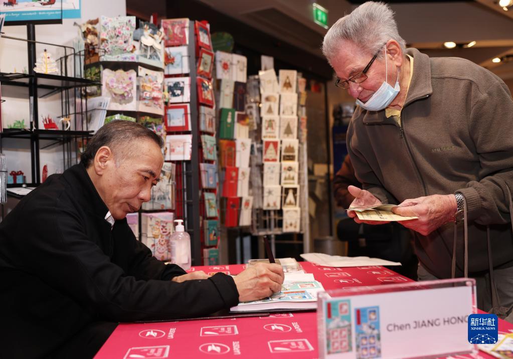 1月14日,在法國巴黎舉行的兔年生肖郵票發行儀式上,郵票設計者陳江洪(左)為集郵愛好者簽售兔年生肖紀念郵票。