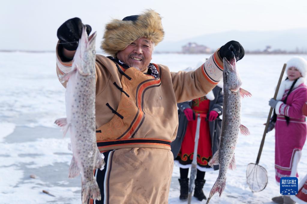 1月11日,在撫遠市東湖,赫哲族群眾展示剛捕上來的魚。