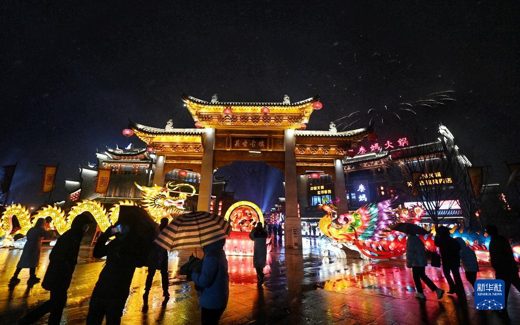 1月14日,人們在湖北省襄陽市樊城區關圣古鎮景區欣賞夜景。