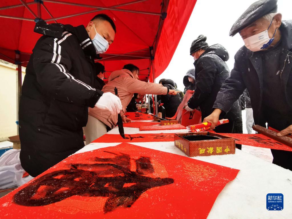 1月14日,在山東省濱州市濱城區北鎮大集,書法愛好者在“黃河大集”春節季活動中為人們書寫春聯。