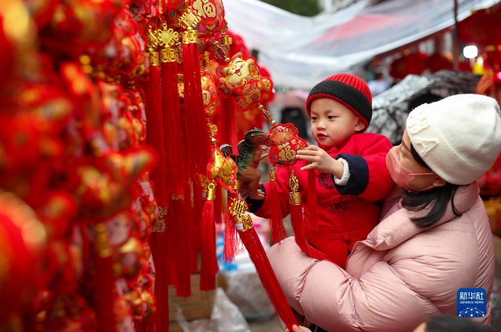 1月14日,人們在貴州省銅仁市玉屏侗族自治縣年貨市場挑選春節飾品。