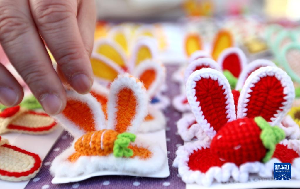 1月15日,一名市民在河北省滄州市的年集上挑選兔子耳朵形狀的發卡。