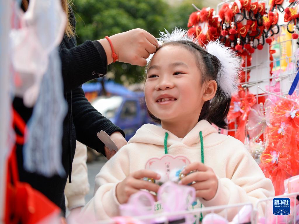 1月14日,小朋友在貴州省黔南布依族苗族自治州羅甸縣的年貨市場上選購飾品。