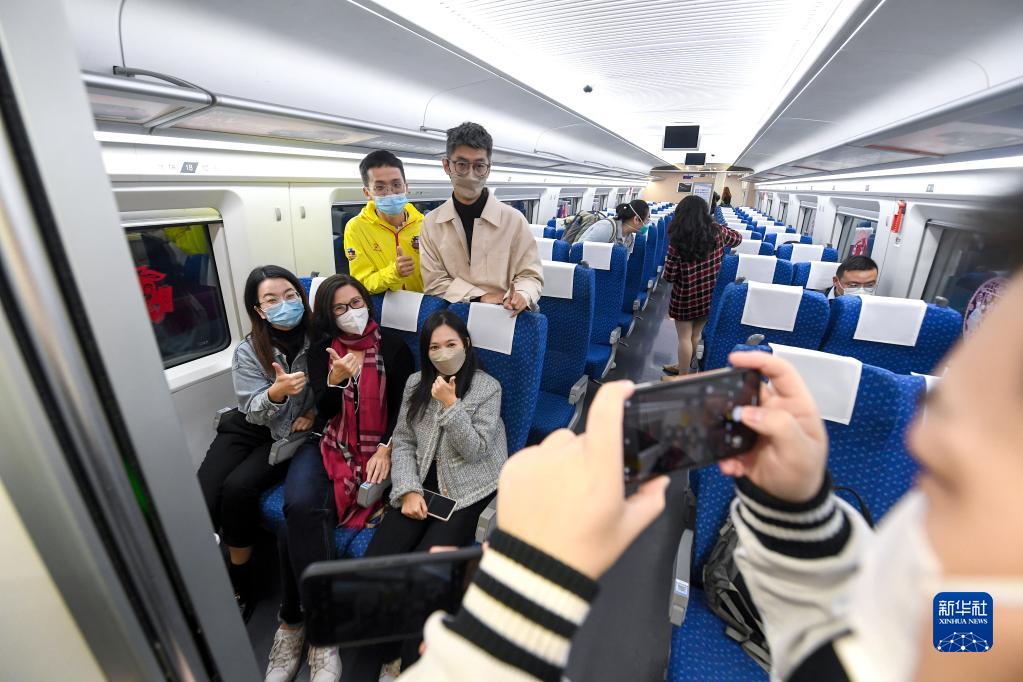1月15日,在深圳北站,搭乘恢復通車后內地駛往香港首趟列車G5607次的乘客在車廂里留影。