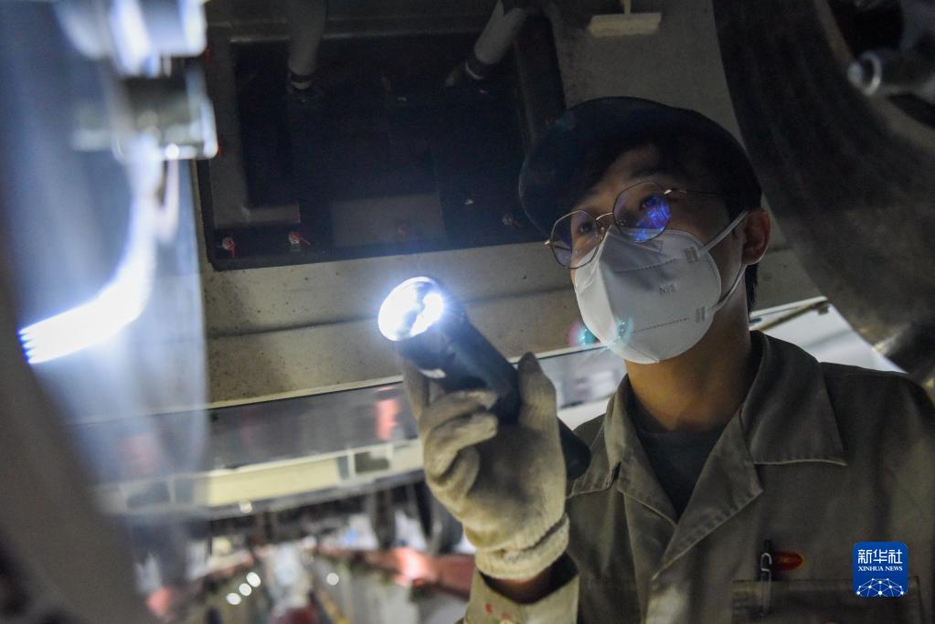 1月14日晚,在烏魯木齊車輛段動車組運用所,機械師在檢查動車組制動盤。