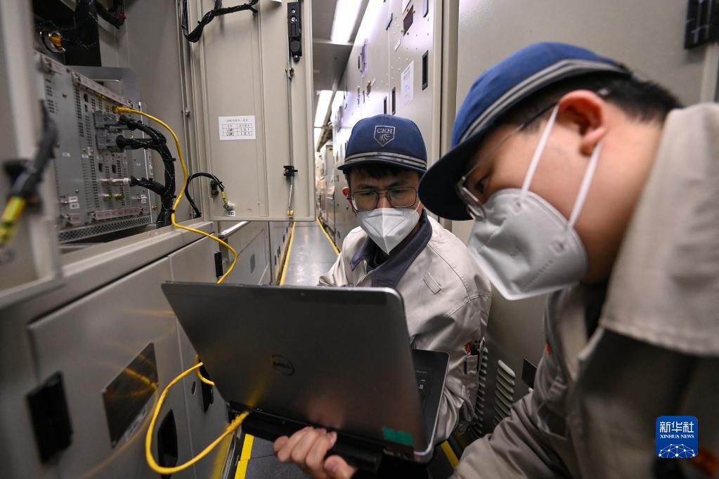 1月14日晚,在烏魯木齊車輛段動車組運用所,機械師在動力車進行動車組運行數據分析。