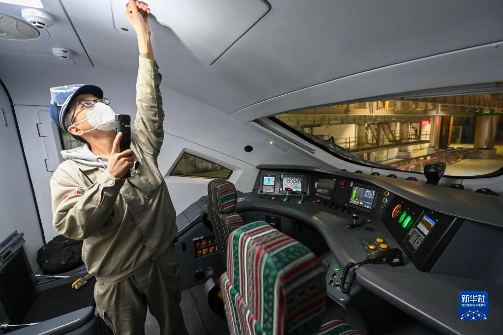 1月14日晚,在烏魯木齊車輛段動車組運用所,機械師檢查動車組司機室設備。