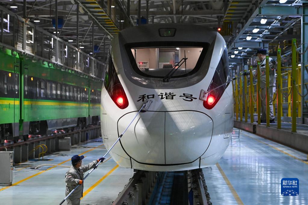 1月14日北方小年夜,烏魯木齊車輛段動車組運用所檢修庫內燈火通明,白天馳騁天山南北的動車在這里集結,一群青年機械師在連夜進行檢查、測試、維修工作,以保障動車運行安全。