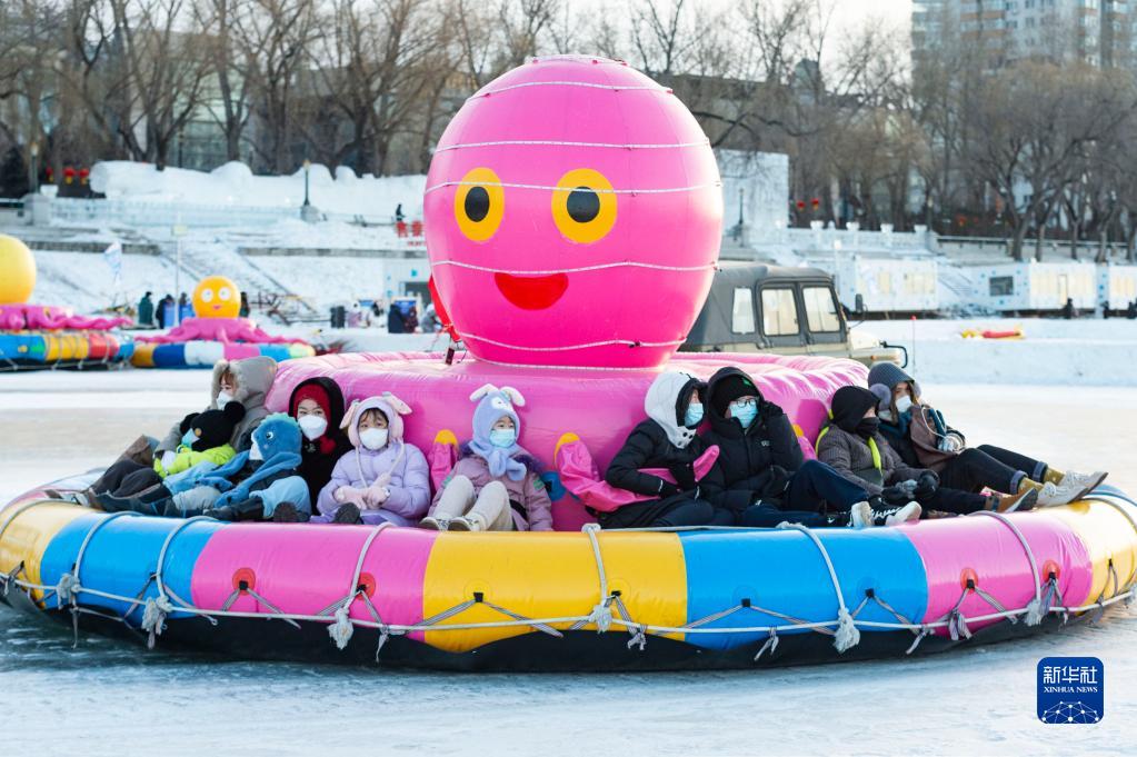 1月14日,游客在哈爾濱松花江冰雪嘉年華園區內體驗冰雪娛樂項目。