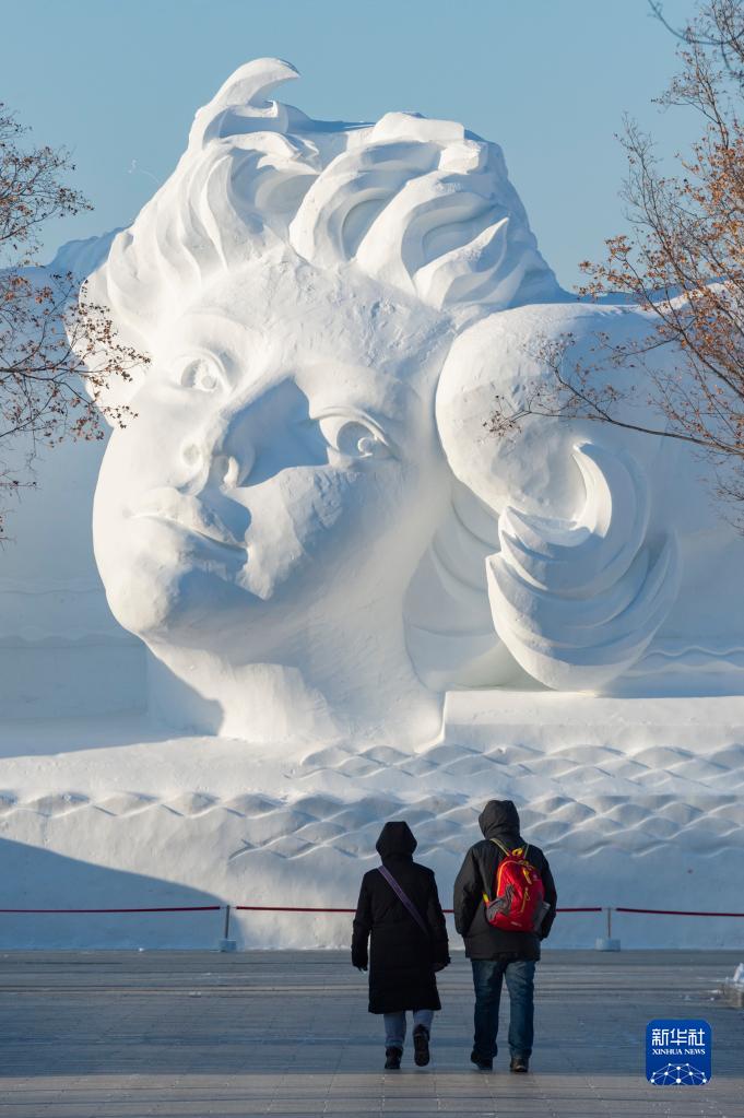 1月3日,游客在哈爾濱太陽島雪博會園區內觀賞大型雪雕。