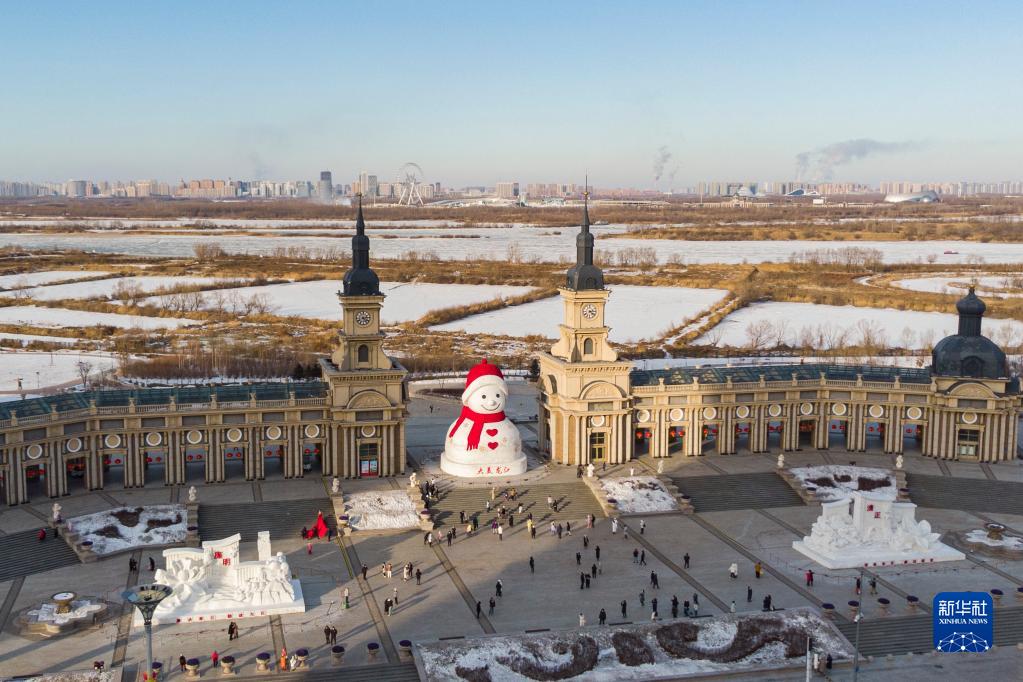 1月14日,游客前來“打卡”松花江哈爾濱段江畔的“網紅”大雪人(無人機照片)。
