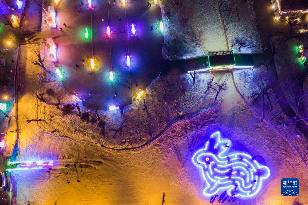 1月14日拍攝的哈爾濱冰燈藝術游園會園區內的冰雕和冰迷宮(無人機照片)。