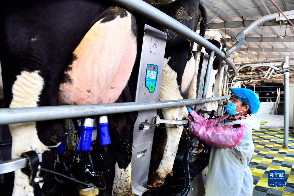 1月15日,在衛崗乳業日照鮮純生態牧業有限公司,工作人員在進行擠奶作業。