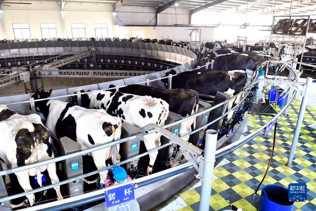 1月15日,在衛崗乳業日照鮮純生態牧業有限公司,工作人員在進行擠奶作業。