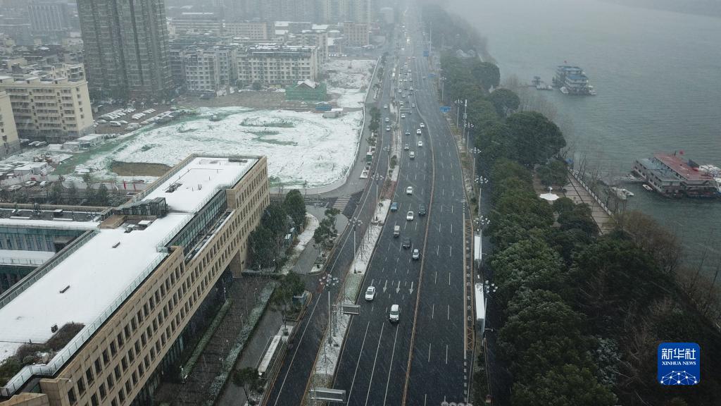 1月15日,在長沙市天心區湘江中路,車輛在雪中行駛(無人機照片)。