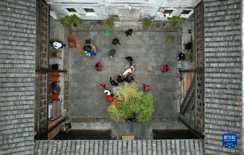 1月15日,在黃平縣舊州古鎮,村民在打糍粑(無人機照片)。
