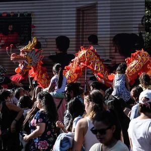 1月14日,在智利首都圣地亞哥,人們觀看舞獅表演。