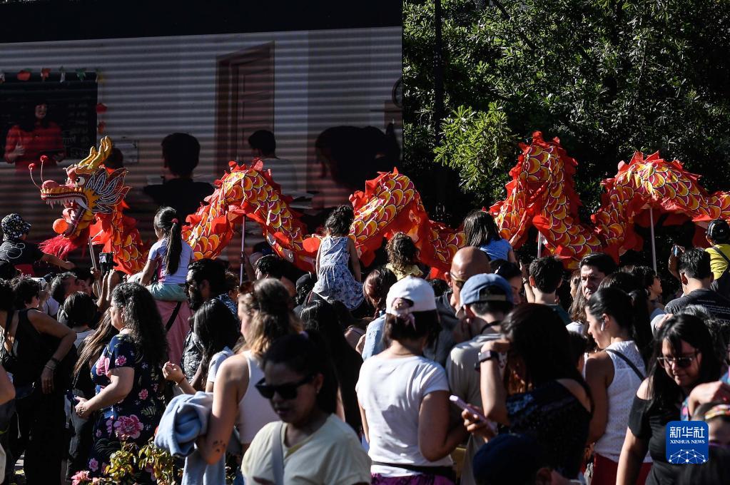 1月14日,在智利首都圣地亞哥,人們觀看舞龍表演。