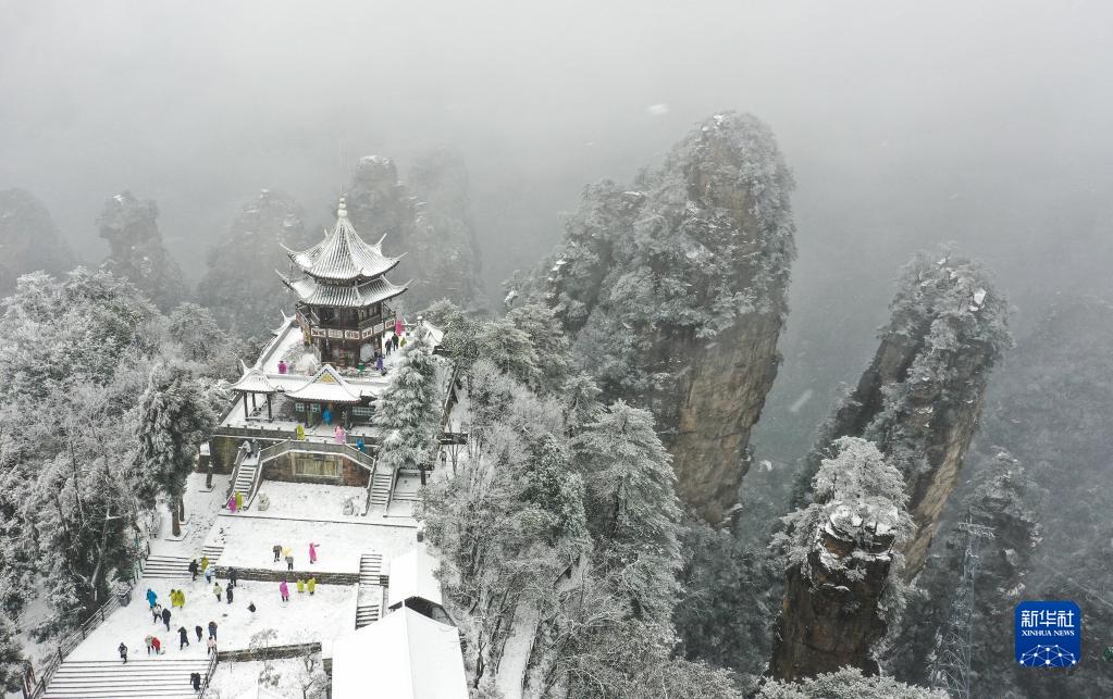 當日,湖南張家界國家森林公園大雪紛飛,銀裝素裹,宛如畫卷,吸引不少游客。