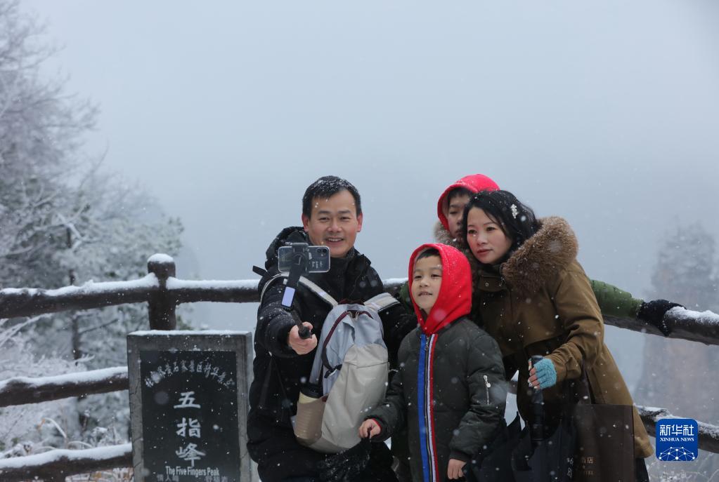 當日,湖南張家界國家森林公園大雪紛飛,銀裝素裹,宛如畫卷,吸引不少游客。