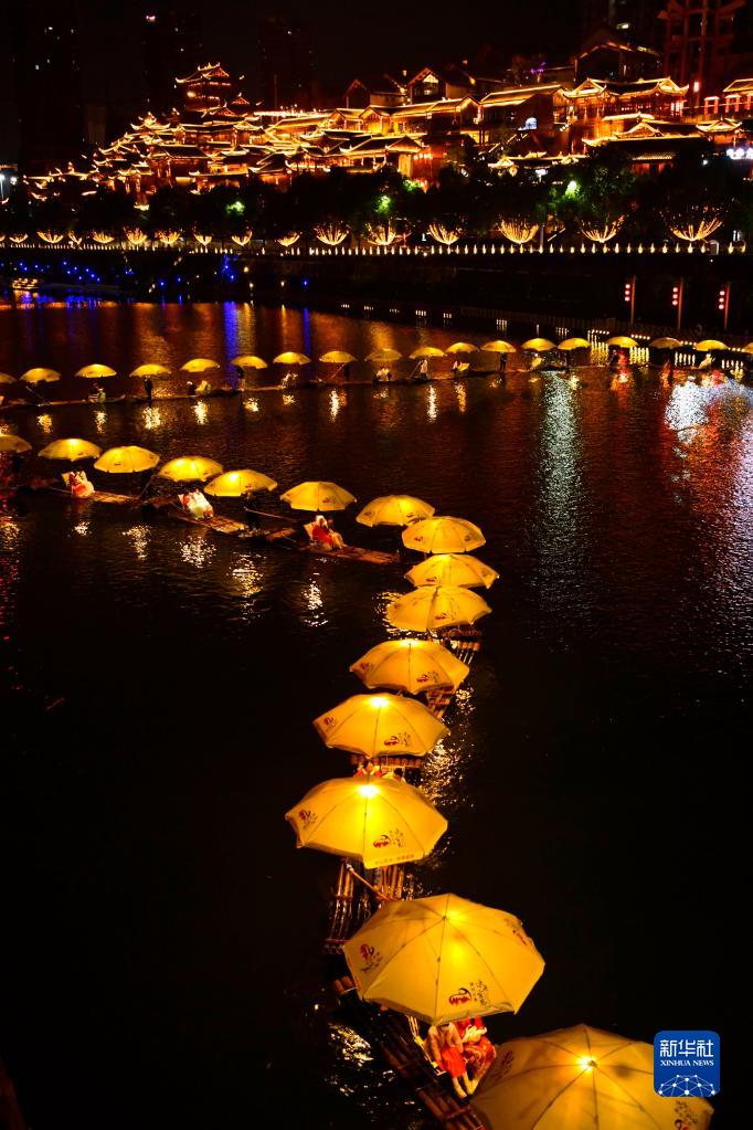 當日,在湖北省恩施土家族苗族自治州宣恩縣貢水河上,一場“貢水游龍”迎新春活動吸引不少市民游客參與體驗?!柏曀锡垺庇蓴凳畻l竹筏作“龍身”,輔以燈光、音樂,人們可以在貢水河上“乘龍”觀賞璀璨夜景,歡樂迎新春。