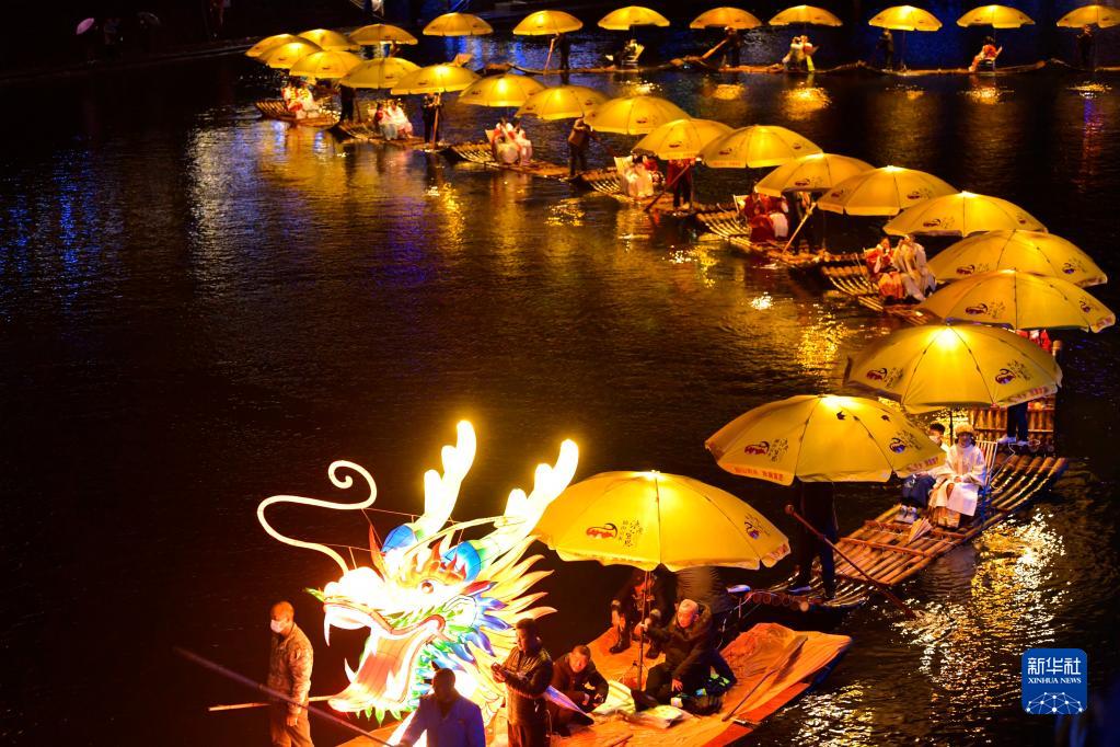 當日,在湖北省恩施土家族苗族自治州宣恩縣貢水河上,一場“貢水游龍”迎新春活動吸引不少市民游客參與體驗?!柏曀锡垺庇蓴凳畻l竹筏作“龍身”,輔以燈光、音樂,人們可以在貢水河上“乘龍”觀賞璀璨夜景,歡樂迎新春。