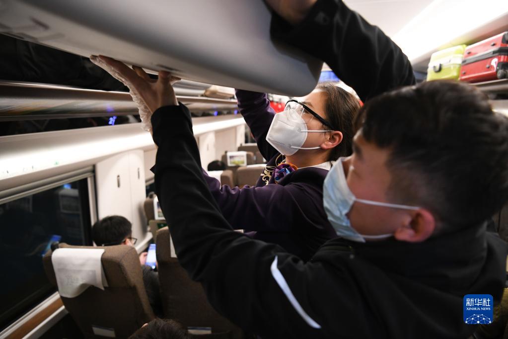1月14日凌晨,在上海虹橋開往亳州南的G9480次高鐵列車上,中國鐵路上海局集團有限公司合肥客運段列車員王昊(后)幫助旅客擺放行李。