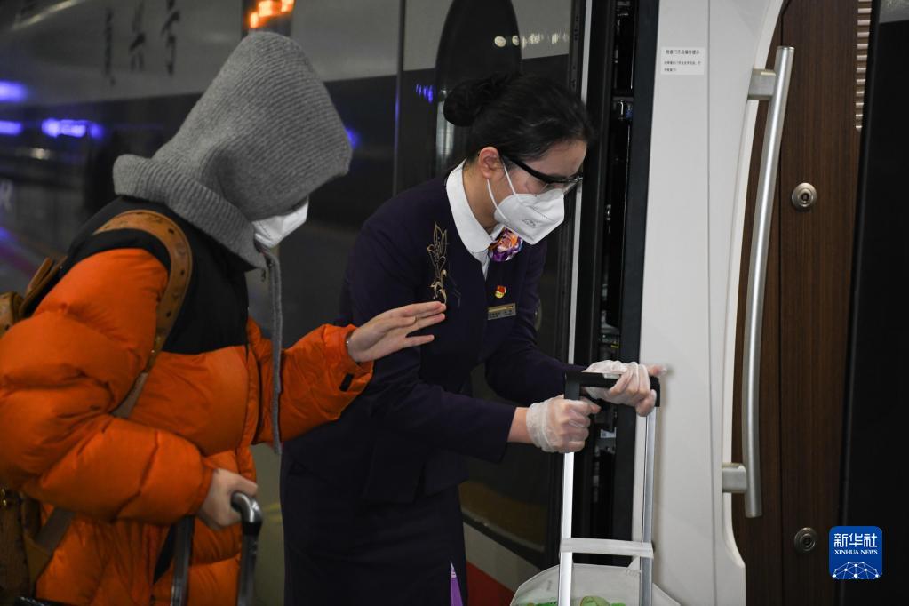 1月14日凌晨,上海虹橋開往亳州南的G9480次高鐵列車??吭诤戏收?,中國鐵路上海局集團有限公司合肥客運段列車員王昊(右)引導旅客上車。
