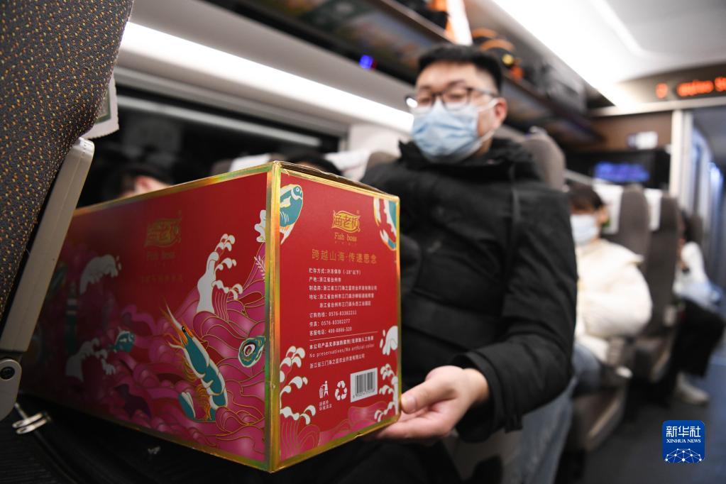 1月14日凌晨,在上海虹橋開往亳州南的G9480次高鐵列車上,一名旅客展示自己要帶回家的年貨。