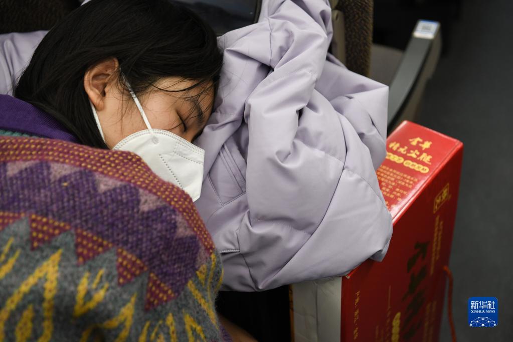 1月14日凌晨,在上海虹橋開往亳州南的G9480次高鐵列車上,一名旅客進入夢鄉,身旁擺放著她要帶回老家的年貨。