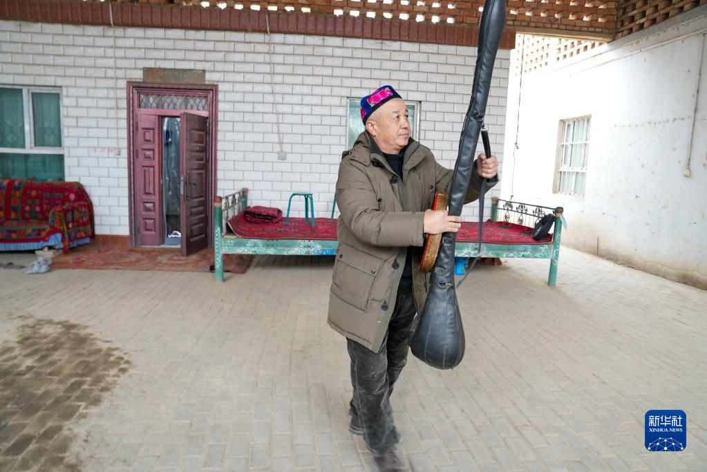 1月11日,在鄯善縣魯克沁鎮木卡姆村的家里,蘇來曼·阿不都拿著心愛的樂器準備去參加一場文藝演出活動。