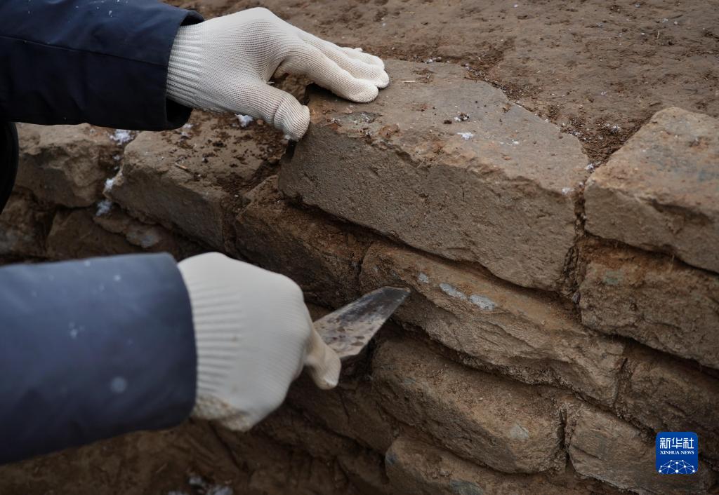 1月14日,考古工作人員在清理河南漢魏洛陽城宮城遺址內的倉窖區磚砌水道。
