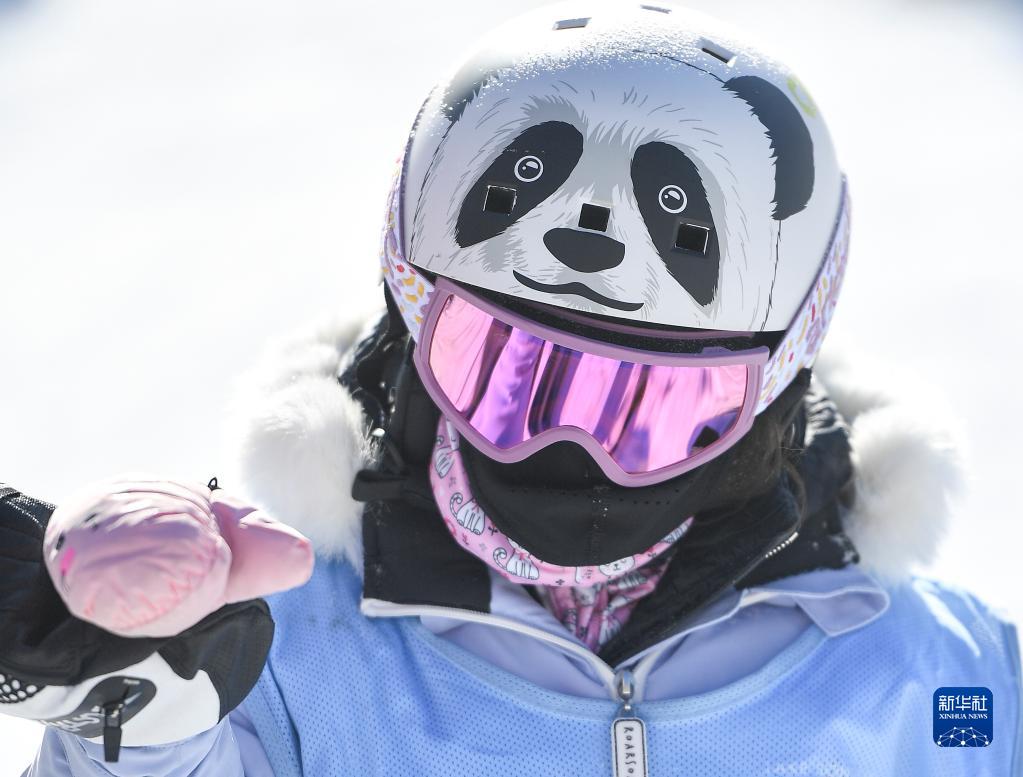1月15日,一位小朋友滑雪時頭戴熊貓紋飾的頭盔。