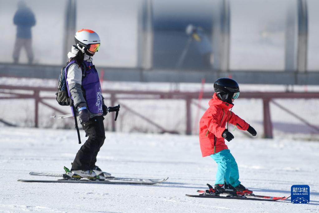 1月15日,一位小朋友(右)在教練的指導下學習滑雪。