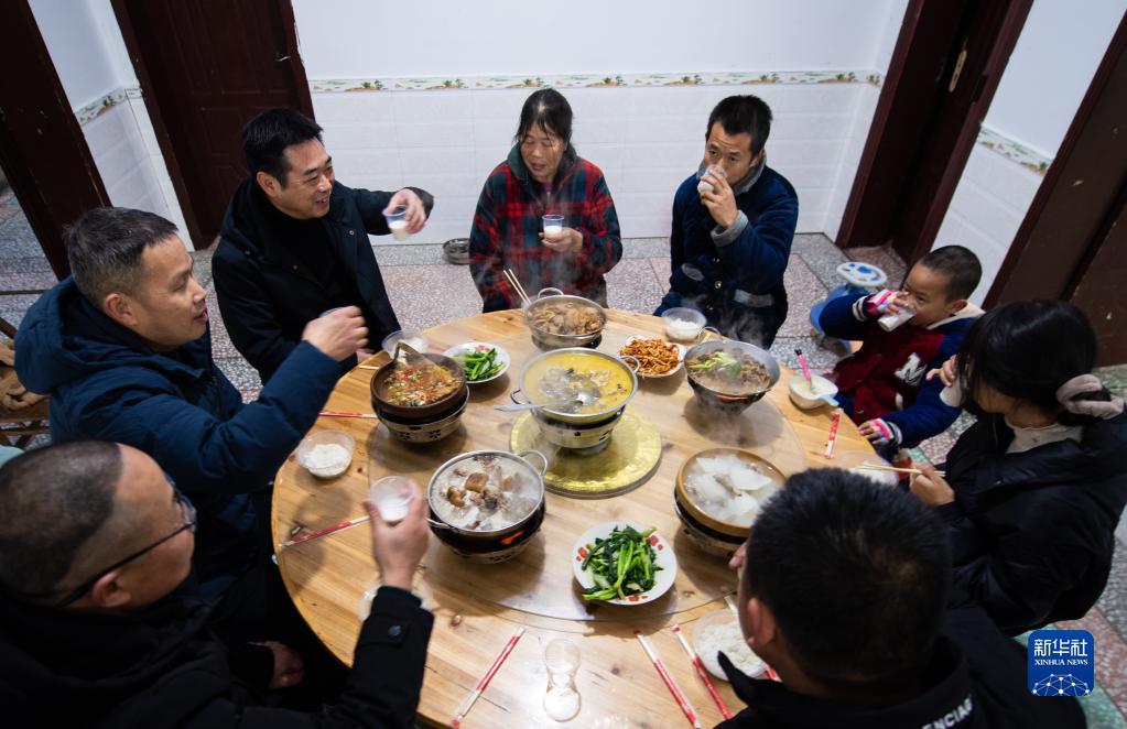 1月15日,在漢壽縣豐家鋪鎮筆架村,鄉村振興駐村工作隊成員在脫貧戶家中吃年飯。