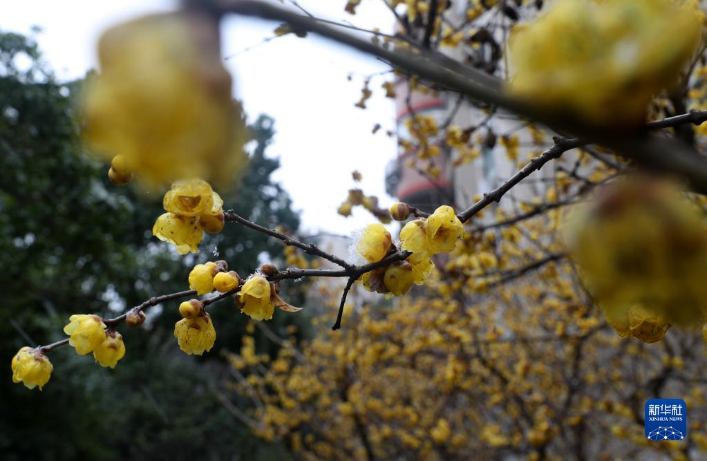 1月15日,在上海閔行區一居民小區內,雪落在臘梅枝頭。