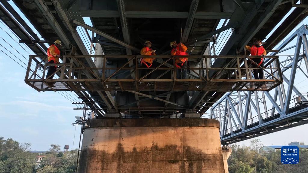 1月14日,在廣西貴港市,陳榮興、陳龍和工友們一起在鐵路郁江橋底部開展檢修工作(無人機照片)。