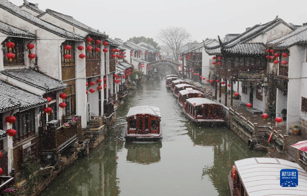 這是1月15日拍攝的江蘇蘇州山塘古街雪景。
