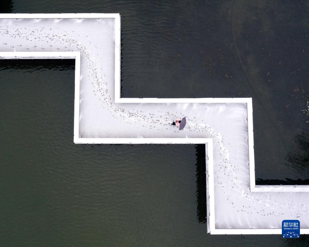 1月15日,市民行走在安徽巢湖市洗耳池公園布滿積雪的曲橋上(無人機照片)。
