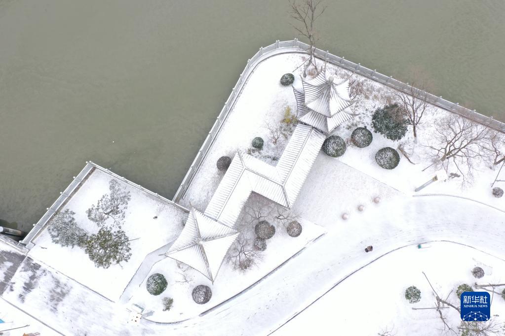 1月15日,市民在江蘇省寶應縣寶射河休閑體育公園賞雪(無人機照片)。