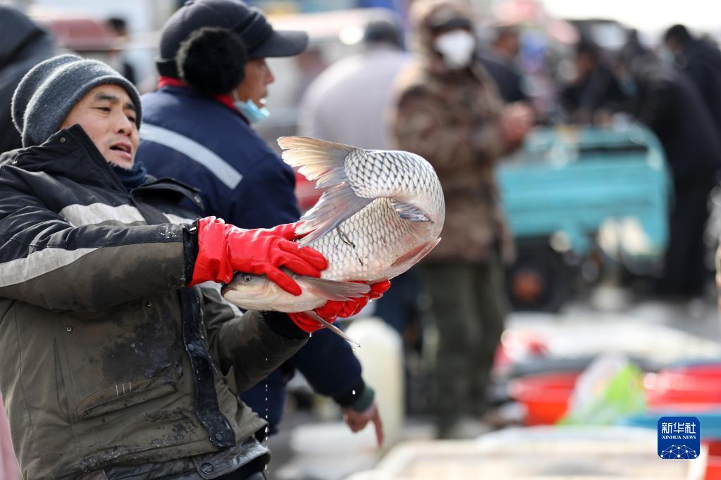1月15日,在山東省臨沂市郯城縣郯城街道十里年集上,一名攤主在為顧客選取鮮魚。