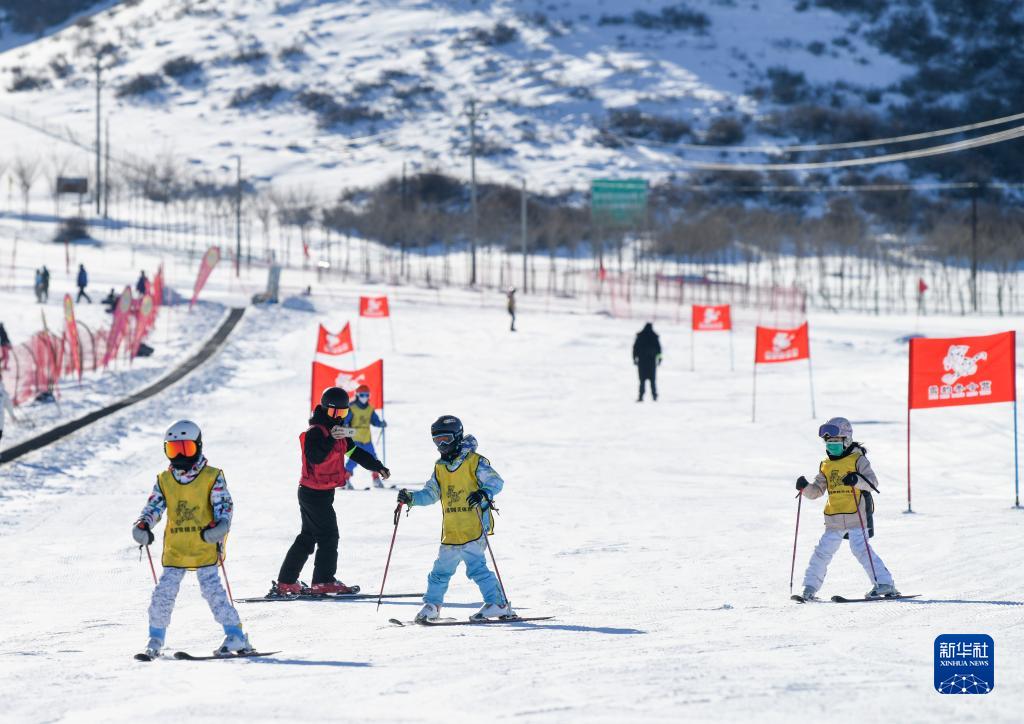 在新疆白云國際滑雪場上,小朋友們跟隨教練學習滑雪技能(1月13日攝)。