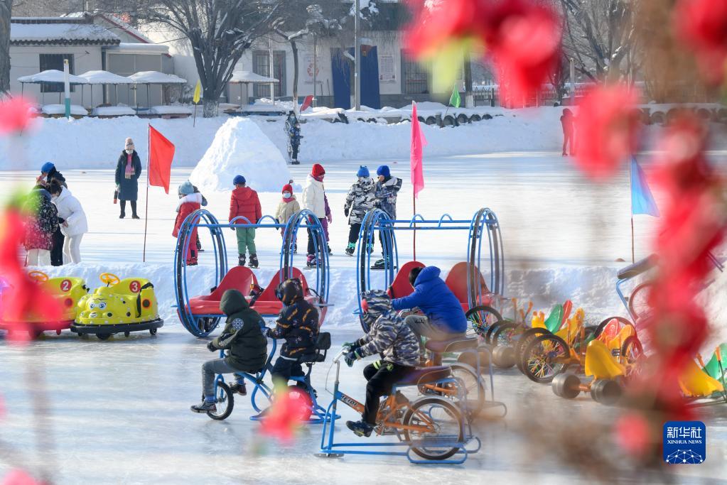 1月15日,小朋友們在烏魯木齊紅山公園冰場上玩耍。