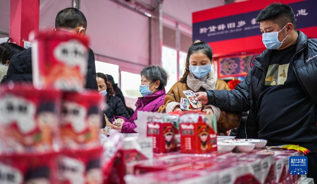 市民在貴陽市南明區蘭花廣場年貨節現場選購商品(1月14日攝)。