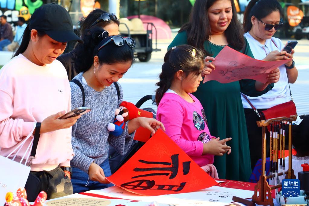 1月14日,在阿聯酋迪拜世博城,人們在中國·自貿試驗區開封片區搭建的“歡樂春節”非遺廟會專題展位欣賞書法作品。