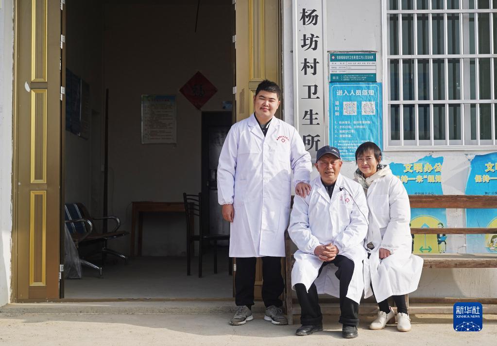 在江西省豐城市鐵路鎮楊坊村衛生所門前,村醫徐秋生(中)與女兒和孫子合影(1月11日攝)。